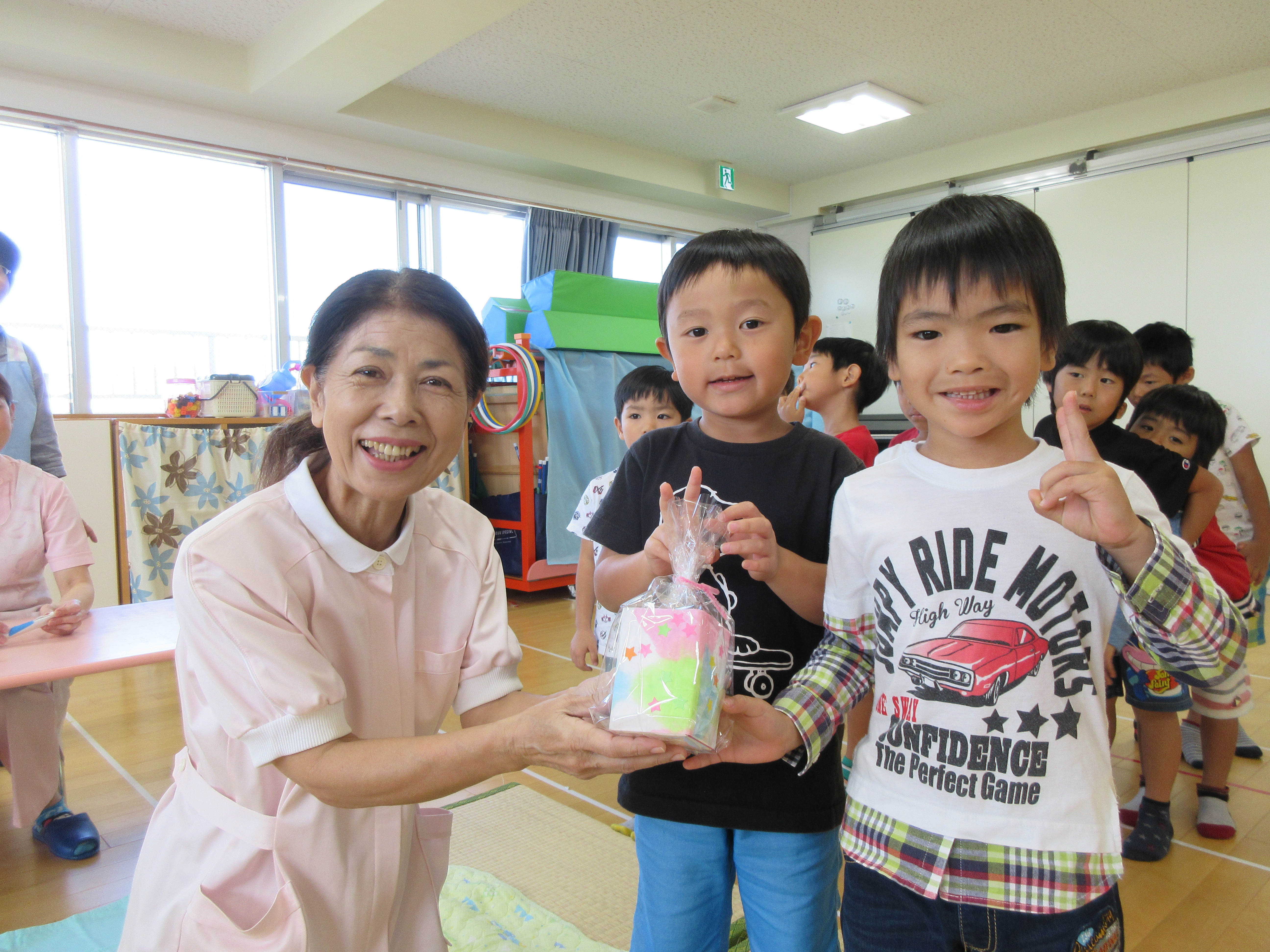 11月15日(金)歯科健診の日にきりん組さんが長堂歯科の先生に勤労感謝の日にペン立てをプレゼントしました。